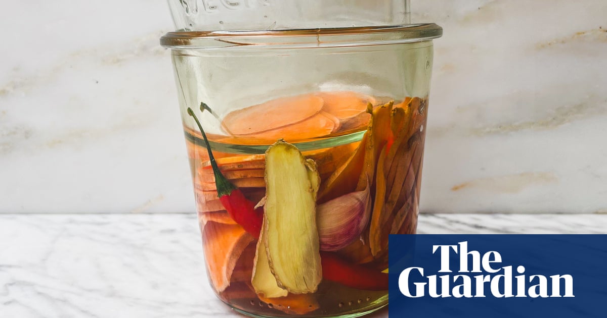 When I made this, I raided the fridge to see what vegetables needed saving, and found some sweet potatoes, ginger, garlic and chilli. I’d never tried pickled sweet potato before, so thought I’d give it a try (unlike regular potatoes, sweet potatoes can be eaten raw in small quantities). I sliced it into rounds, but left the garlic clove and chilli whole. When you apply hot pickling liquor to vegetables, they’re ready to eat the moment they’ve cooled down.